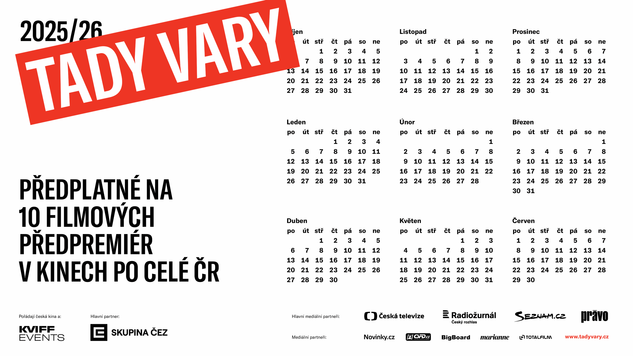 Tady Vary 2025/26 jsou filmová sezóna s předplatným. Do českých kin přináší festivalovou atmosféru a 10 filmů v předpremiéře. Pořídíte si výhodné předplatné (3 z 10 filmů budete mít zdarma) a v kalendáři vyznačíte 10 večerů mezi zářím 2025 a červnem 2026. Jednou měsíčně se projdete po červeném koberci a užijete si předpremiéru jednoho z nejzajímavějších současných snímků. Spolu s vámi budou film ve stejnou chvíli sledovat diváci po celé ČR. Atmosféru podpoří také úvod přenášený do všech kin.